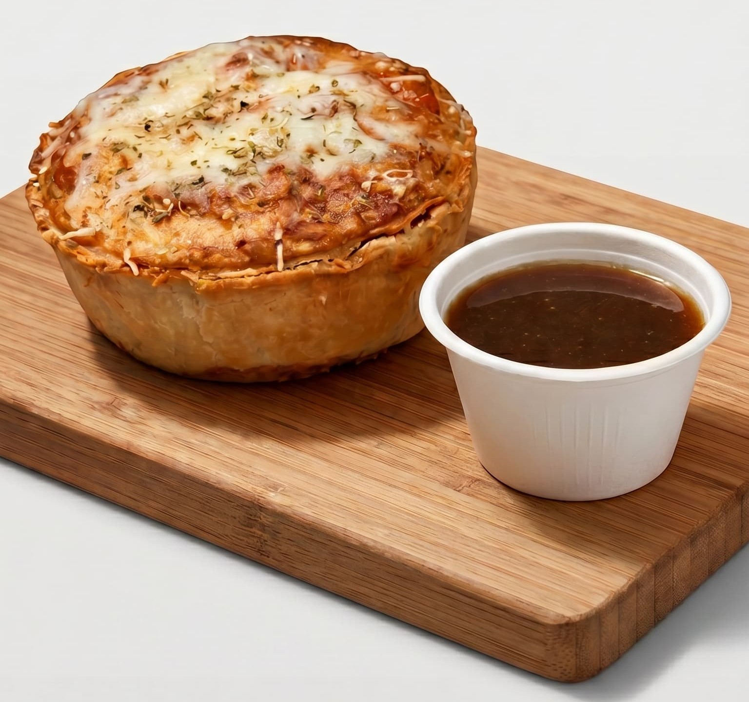 Marinated shaved beef and sweet caramelized onion smothered in melted Swiss cheese, tucked into our flaky butter crust. Served with a rich au jus for dipping.